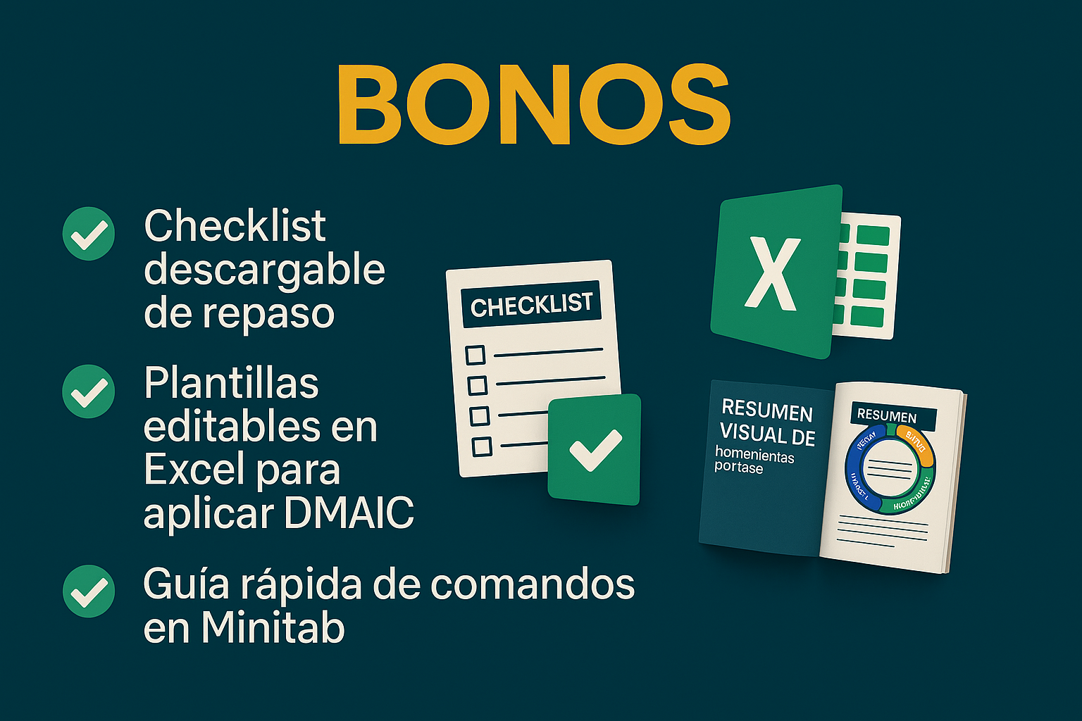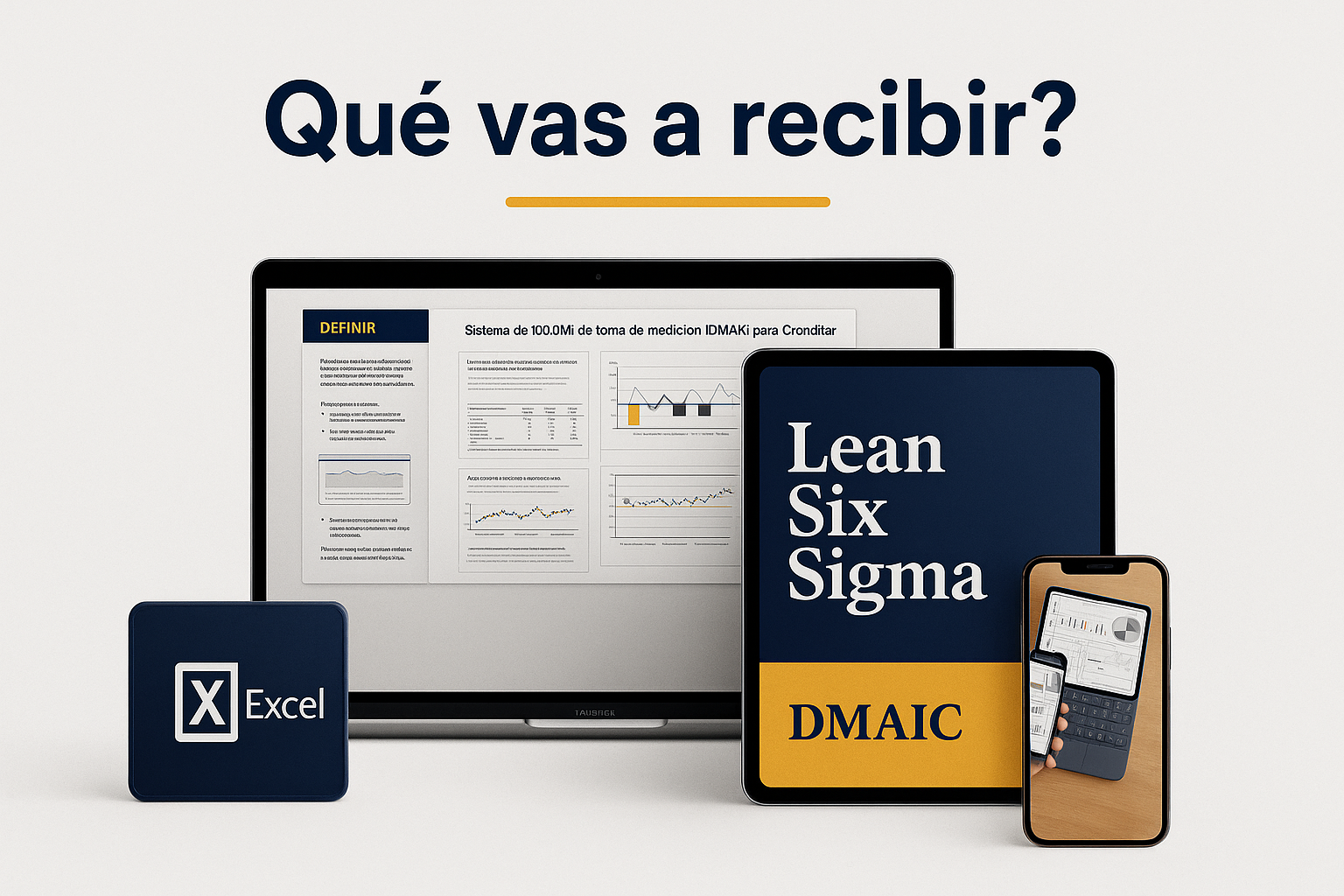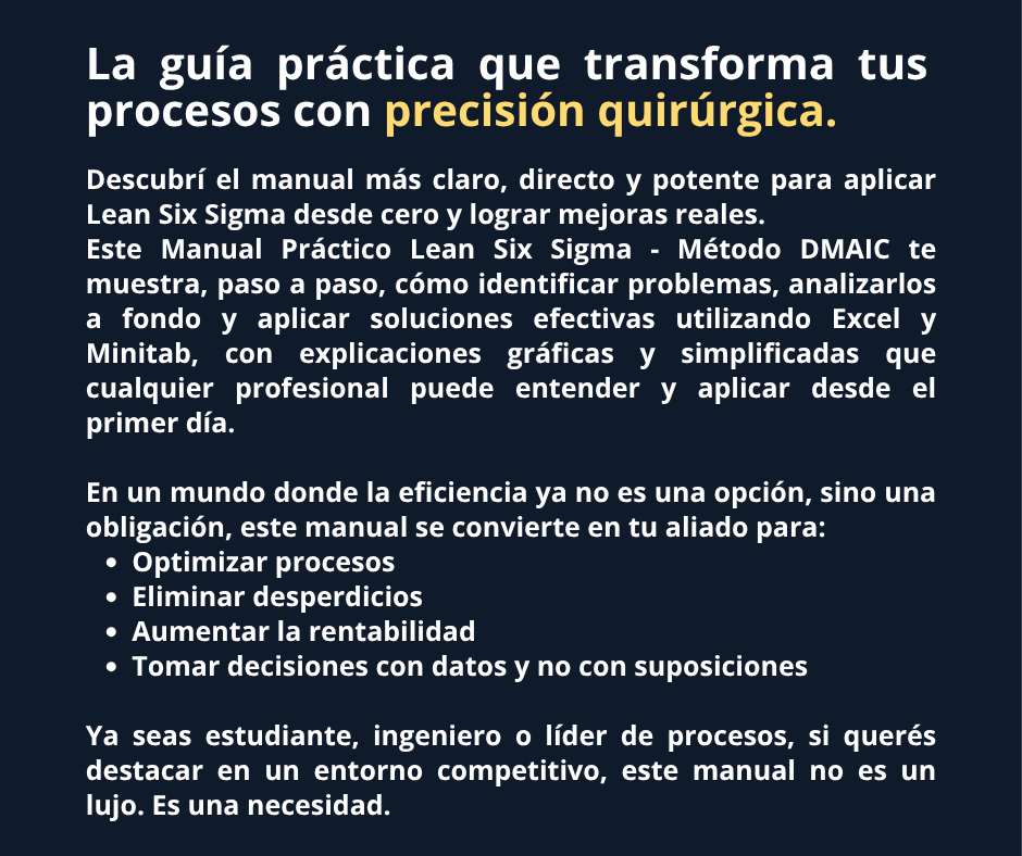 Explicaciones claras y visuales + plantillas listas en Excel y Minitab. Diseñado para que apliqués HOY y veás resultados esta misma semana.